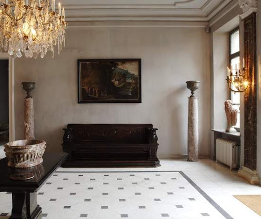 I love this entry hall. Typically Belgian, austere and cold, this room comes alive with an unexpected touch: an over the top, huge crystal chandelier.
